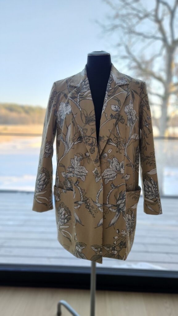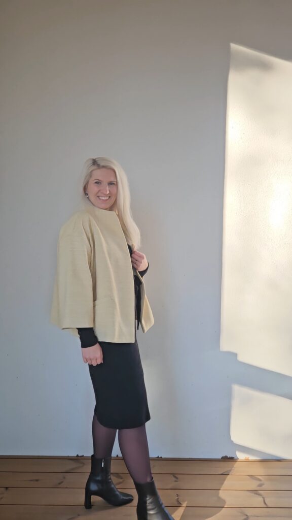 Kuvan takissa yhdistyy pehmeä keltaisen ja beigen sävyt jälleen Pantonen 2026 Colour of the Year -väriin. ”Cloud Dancer” neutraalii off-white-sävy on upea keltaisen rinnalla. Yhdistelmä on kiinnostava, erilainen mutta kuviosta huolimatta rauhallinen. Loistava esimerkki siitä, miten trendivärit otetaan mukaan suunnitellessa asiakkaalle pitkäikäistä ja omanlaista tuotetta.