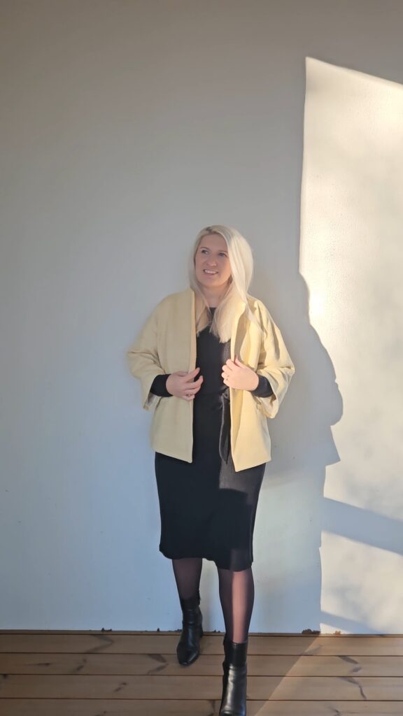 Kuvassa yhdistyvät salvian värinen Margareta merinovillamekko upeaan kierrätysmateriaalista mittatilauksena valmistettuun takkiin, joka huokuu Pantonen vuoden 2026 värisävyä ”Cloud Dancer”. Takissa on muutenkin löydettävissä useaa tämän vuoden trendiväriä ja kokonaisuudesta syntyykin rento, leikkisä mutta silti tyylikäs kokonaisuus.